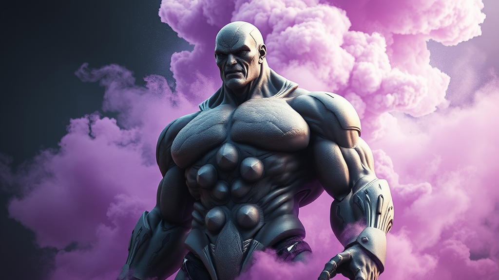 Colossal hybrid entity emerging from swirling purple smoke, boasting a formidable muscular physique reminiscent of a giant, enhanced with sleek robotic elements, rendered in stunning 4k detail.