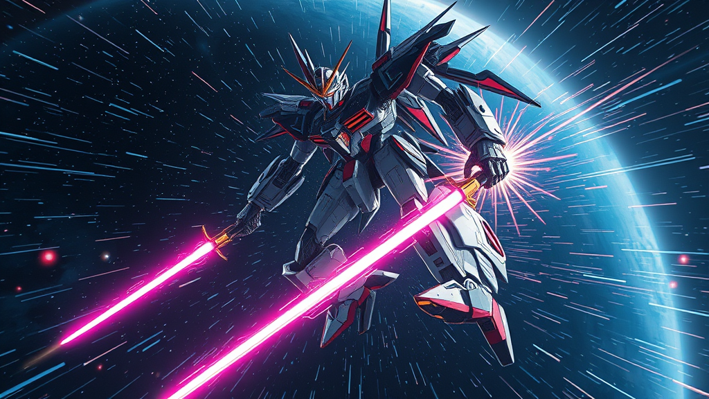 Colossal mech drifting through the vast expanse of space, armed with gleaming energy swords, evoking the intricate artistry of Tsutomu Nihei, reminiscent of Sidonia no Kishi. Gigantic, futuristic design intertwined with the essence of anime, showcasing a sci-fi spectacle. The mech is captured mid-motion, engaged in a ferocious battle, exuding hyper-detailed features with trails of luminous lasers slicing through the cosmic void. Energy pulses ripple outward, creating an impression of acceleration and blinding light flashes. Visualized in a first-person perspective, this scene is rendered with the clarity of 8K super-resolution, merging high-definition mangatic graphics with fluid dynamism, portraying the mech's colossal speed and agility in space.