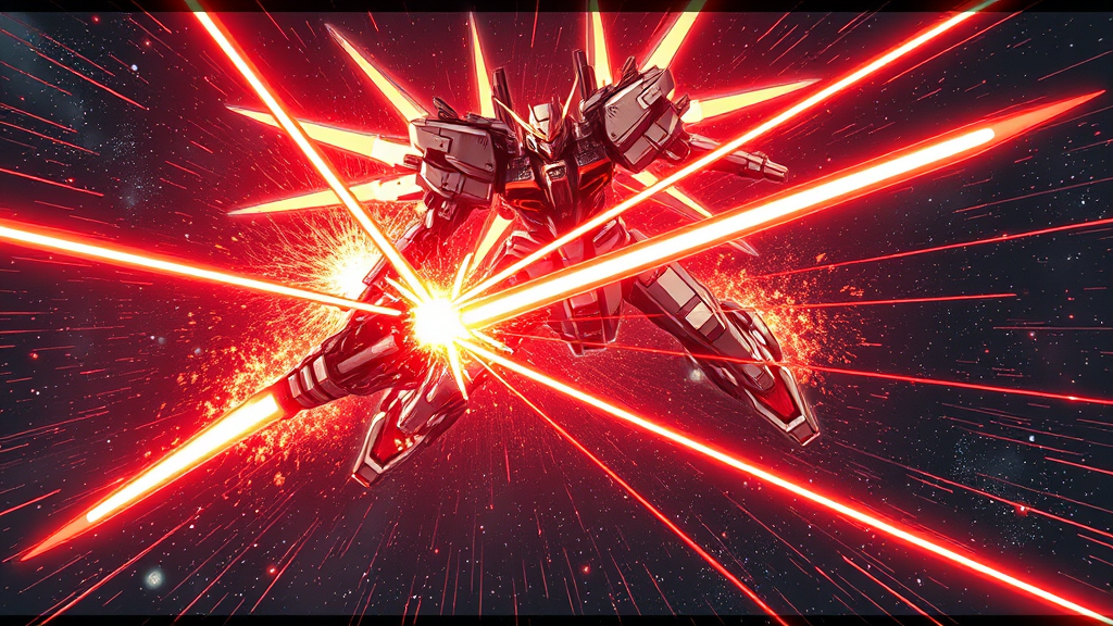 Colossal mech drifting through the vast expanse of space, wielding immense energy-infused blades, reminiscent of Tsutomu Nihei's distinctive art style. Imagine the futuristic world of Sidonia no Kishi where massive machines engage in epic battles amidst the stars. The scene pulses with life, capturing the essence of anime's grandeur. In this vision of gigantism and high-tech aesthetics, the mechs are locked in intense combat, each movement a symphony of kinetic force. The environment is charged with hyper-detailed elements like streaking lasers and energy clusters, showcasing the brutal elegance of light-speed maneuvers. A masterstroke of manga-like graphics, drawing viewers into a first-person perspective of breathtaking acceleration and blinding light flashes. Created in ultra-realistic 8K resolution, every frame a vivid masterpiece of speed and power.