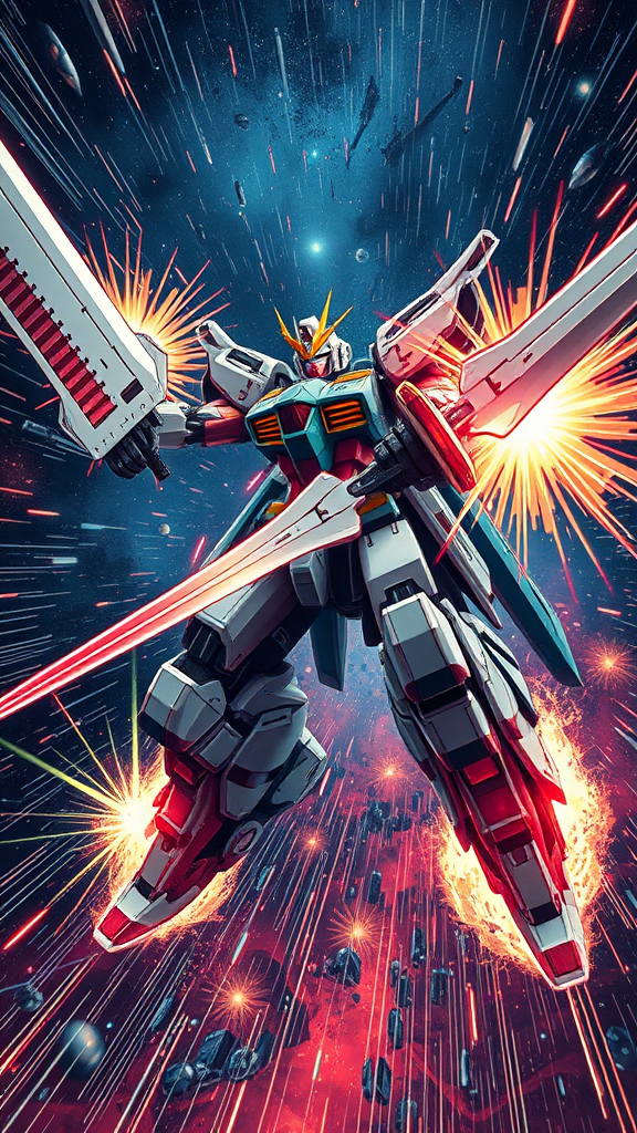Colossal mech in the depths of space wielding massive swords, inspired by the Tsutomu Nihei style and Sidonia no Kishi aesthetics, showcasing anime gigantism and futuristic sci-fi elements. The mech is depicted in dynamic motion, engaging in combat with hyper-detailed features, amid brilliant laser beams and swirling energy clots. It accelerates through the void, leaving trails of light flashes, showcasing immense speed. The scene captures a first-person perspective in stunning 8K, HD, with super-resolution quality, reflecting the intricate detailing typical of manga graphics, embodying an epic clash set in the vastness of the cosmos.
