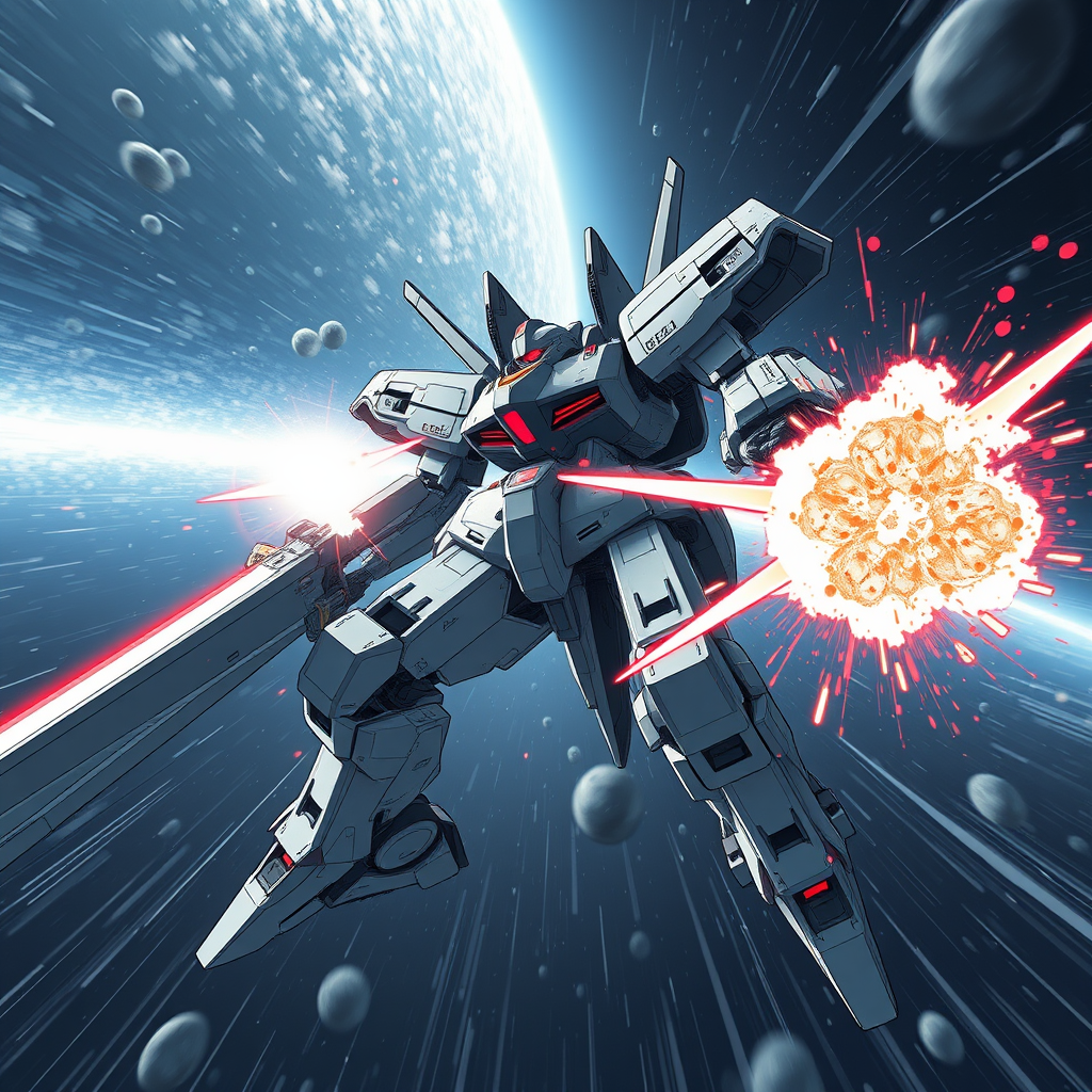 Colossal mech in the vast expanse of space, wielding massive swords, inspired by Tsutomu Nihei's style, with elements of Sidonia no Kishi. Anime aesthetics meet a world of gigantism and advanced sci-fi, showcasing a futuristic design. The mech is in dynamic motion, engaging in combat with hyper-detailed visuals. Lasers slice through the void of space, amidst swirling energy clots. The scene captures acceleration and bursts of light, conveying immense speed. First-person perspective enhances the intensity. Ultra-high-definition, 8K resolution illustrates the scene with manga-style graphics, immersing viewers in this epic space battle.
