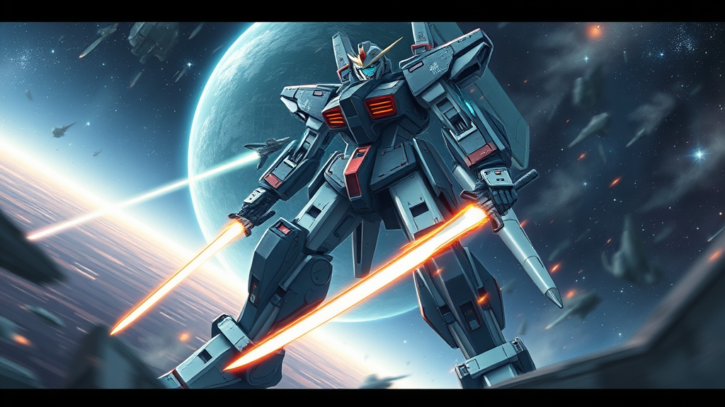 Colossal mech in the void of space, wielding gleaming swords, influenced by Tsutomu Nihei's style, reminiscent of Sidonia no Kishi, anime-inspired, towering presence, space exploration, advanced futuristic aesthetics, Sci-fi epic, dynamic motion, intense battle scene, intricately detailed, lasers slicing through space, energy surges, rapid acceleration, bursts of light, high-speed action, artwork capturing a first-person perspective, ultra-high definition, 8K resolution, super-detailed manga graphics.
