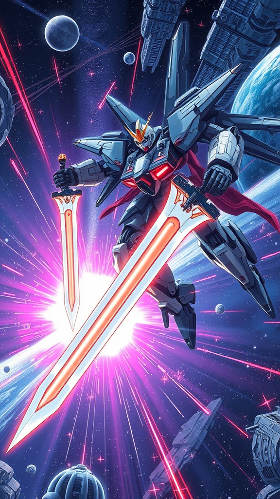 Colossal mech traversing the depths of space, armed with shimmering swords, inspired by Tsutomu Nihei's signature style, reminiscent of Sidonia no Kishi, anime-infused with a sense of monumental scale, set against a backdrop of a futuristic universe. Sci-fi elements in full display, capturing the kinetic energy and fluidity of combat, with intricate details woven into the design. Lasers pierce the cosmic void, energy pulses crackle, acceleration thrums with intensity, light splashes through the vastness, depicting breathtaking speed. Illustrated from a first-person perspective, rendered in 8K HD with super-resolution clarity, embracing the essence of manga artistry.