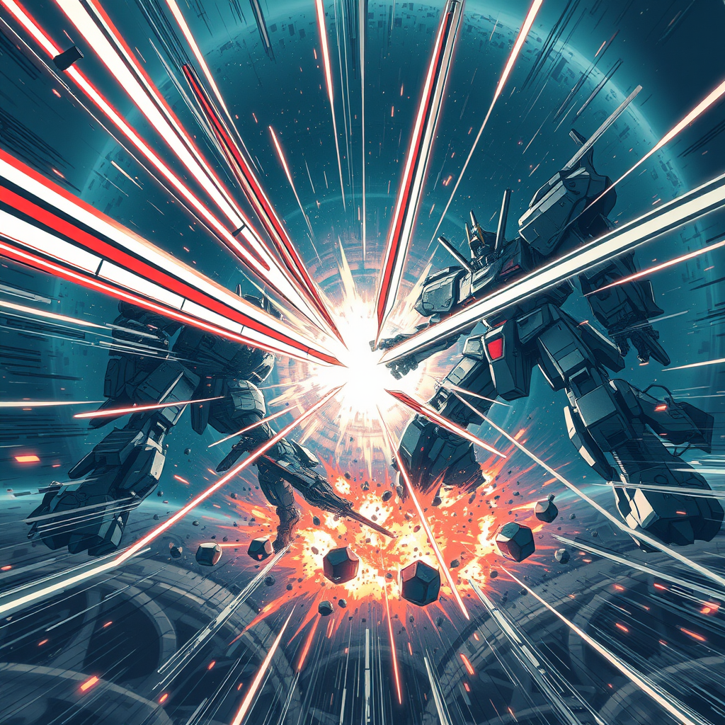 Colossal mechs battling in the void of space, wielding massive swords, inspired by the artistic style of Tsutomu Nihei, reminiscent of the epic series Sidonia no Kishi. Set in a vast, futuristic expanse, these machines embody gigantic proportions and intricate detail, showcasing the essence of anime and sci-fi. In rapid motion, the mechs clash, surrounded by dazzling light flashes and bursts of energy clots. High-speed battles unfold with lasers streaking through the cosmos. The scene captures the action from a first-person perspective, rendered in hyper-detailed manga graphics, achieving 8K, HD, and super-resolution quality.