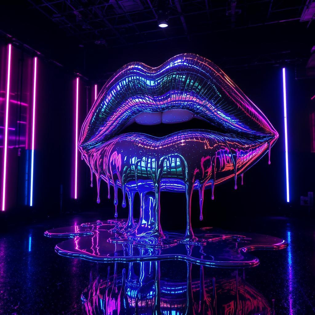 Colossal metallic lips glisten under neon lights, adorned with glistening lipstick that drips onto the floor, pooling into vibrant liquid reflections. A fusion of neon glow, sleek liquid, and shimmering metal creates an otherworldly spectacle.