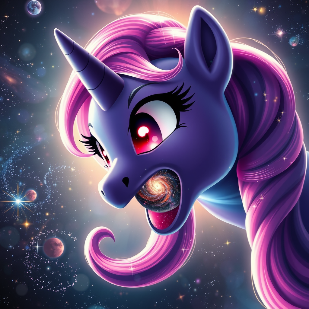Colossal Twilight Sparkle from My Little Pony, transcending galaxies as she floats in the cosmos, a tiny galaxy hovering near her immense mouth. A hyper-realistic close-up captures the scene as she swallows the galaxy, her eyes wide open, glowing with an intense red. Her mane shimmers with cosmic colors, blending with the vastness of space, while stars and celestial bodies weave through her flowing hair. The scene pulsates with otherworldly energy, highlighting the surreal and magnificent juxtaposition of the gigantic Twilight Sparkle and the minuscule galaxy.