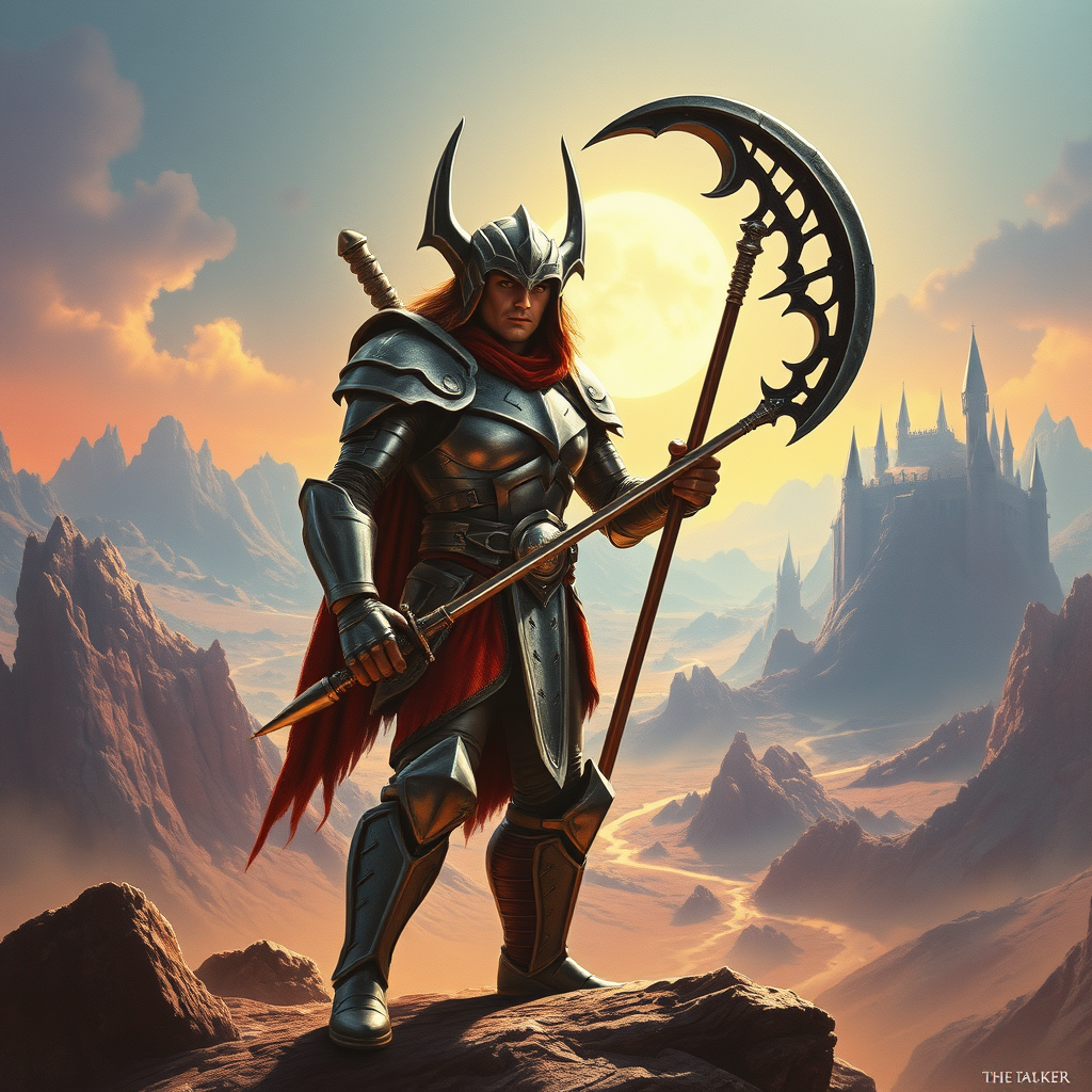 Colwyn, the valiant hero from the movie 'Krull', stands poised in his iconic armor, wielding the legendary Glaive weapon with unwavering confidence. The scene unfolds against the alien landscape of planet Krull, its jagged terrains and imposing castle structures starkly outlined in the distance. The atmosphere is thick with an adventurous aura, emphasizing Colwyn's resolve and the formidable yet enchanting beauty of Krull, as captured in the essence of a cinematic poster art style. The image is infused with sharp, dynamic lines, and a dramatic play of light and shadow emulates the high fantasy aesthetic of '80s movie posters. The composition embraces hyperrealism, with a vibrant interplay of light and dark enhancing the mythical aura surrounding the warrior. Subtle creative twists weave through the depiction, adding fresh nuances while retaining the core adventurous spirit.