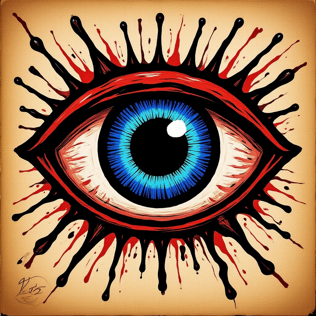 View this AI-generated image featuring a noir comic art style depiction of an eye splattered with vibrant paint and ink stains set against textured brown paper with gothic black and white contrasts the piece embodies elements of angura kei monumental ink paintings and chiaroscuro portraiture featuri