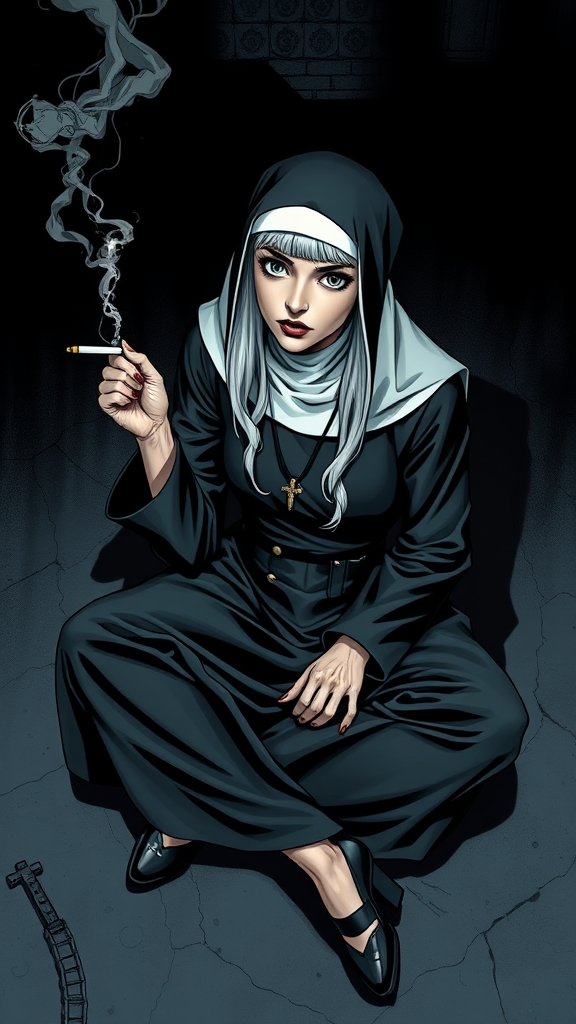 Comic book cover illustration, full body shot of a silver-haired nun, holding a cigarette with a nonchalant attitude, sitting cross-legged, contemplative on a shadowy background, viewed from above, intricate detail, dramatic, comic book cover, striking presence, dynamic pose, proportion 4:5, with unique personal elements and a touch of futurism.