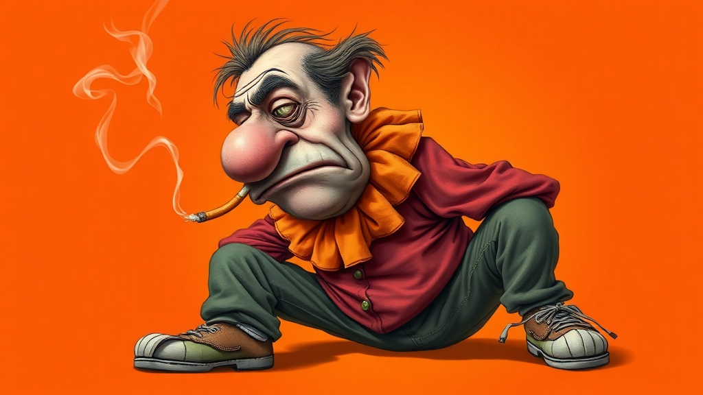 Comical caricature of a disheveled, 45-year-old clown, exuding a grumpy and fatigued demeanor. His elongated face features a prominent bulbous nose and tired, droopy eyes, accentuating his sunken cheeks and a notably protruding chin. This lanky figure sports a shabby red shirt, topped with a crumpled orange collar. A lit cigarette precariously dangles from his lips, emphasizing his disgruntled expression. He strikes a slouched pose against a vibrant orange backdrop, with tendrils of smoke curling upwards, adding to the chaotic aura. His mismatched shoes and patched trousers complete the ensemble, offering a touch of whimsy amidst his disarray.