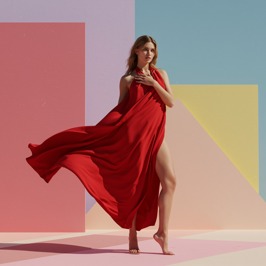 Commercial photo capturing a stunning Instagram fashion model in a vibrant red wrap, posing elegantly amidst a backdrop inspired by colorful geometrical patterns, reminiscent of Guy Aroch and Helene Knoop. The scene is rendered with the finesse of Unreal Engine 5, highlighting glowing pastel shades and bold lines. The composition bursts with sun-soaked colors and bright, eye-catching hues. Captured with the clarity of a Fujifilm X-T4 and the precision of a Sony FE 85mm lens, the image boasts a ratio of 900:1600, with a raw, unfiltered style, encapsulating the essence of creative fashion photography.