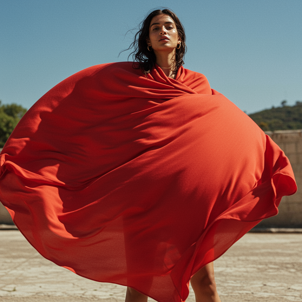 Commercial photo of a stunning fashion model striking a pose in a vibrant red wrap, inspired by colorful geometric patterns and the artistry of Guy Aroch and Helene Knoop in Unreal Engine 5. The scene is bathed in glowing pastels with bold lines and bright, sun-soaked colors, captured with a Fujifilm X-T4 and a Sony FE 85mm lens. The aesthetic is raw and lively, emphasizing the dynamic interplay of light and shadow against the model's striking attire.