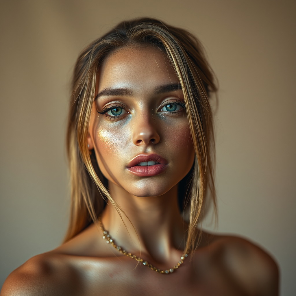 Commercial photo portrait of a captivating Instagram model, embodying sparklecore aesthetics as an innovative appropriation artist, with a focus on shimmering/glossy textures and clear edge definition, showcasing exclusive and unique creative pieces. The color palette features light brown and light amber tones, captured with a Fujifilm X-T4 and a Sony FE 85mm f/1.4 GM lens. The composition is in a 45:56 aspect ratio, with a stylized raw, detailed rendering for a visually striking image.