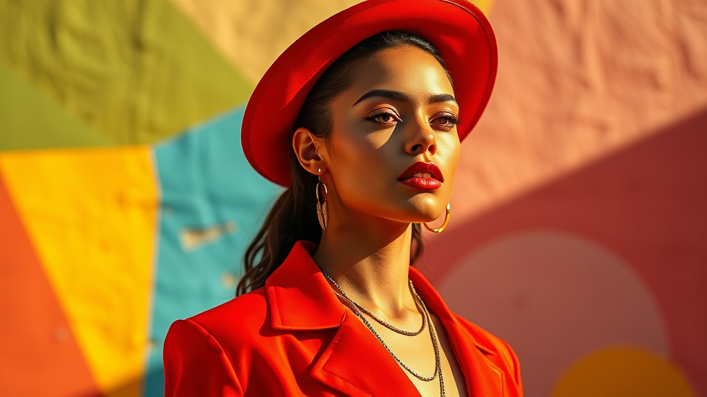 Commercial photograph of a stunning Instagram fashion model in a vibrant red ensemble, styled in colorful geometric patterns, inspired by Guy Aroch and Helene Knoop. Captured in vivid, glowing pastels and sun-soaked hues with bold lines and bright colors. Shot using a Fujifilm X-T4 and Sony FE 85mm lens, creating a raw and dynamic visual aesthetic in the aspect ratio of 9:16, enhanced with Unreal Engine 5 graphic elements.
