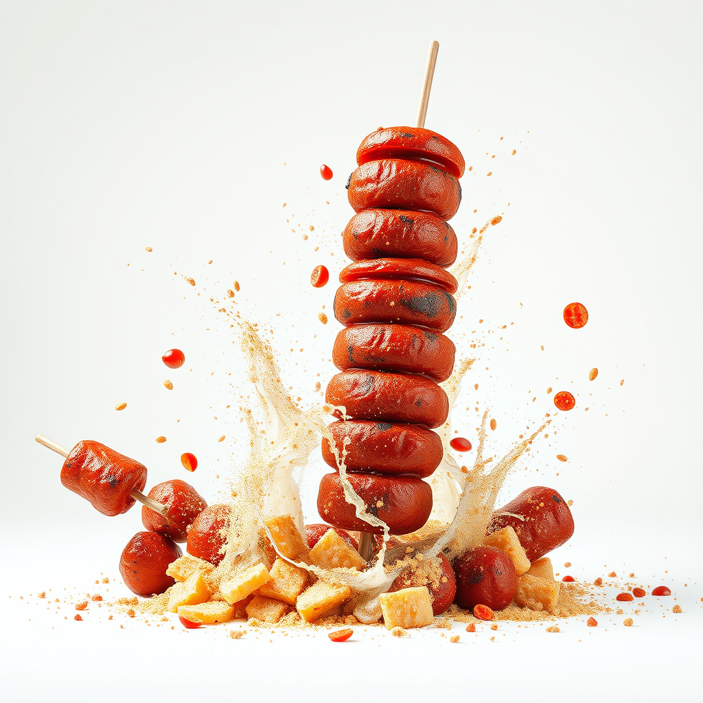Commercial photography, colossal kebab splash, bright white lighting, studio setup, ultra-high-definition rendering, high-resolution photography, incredibly detailed, intricate textures, isolated on a plain white background, 8k quality, stock image style, advanced color grading, --version 4 --aspect ratio 9:16