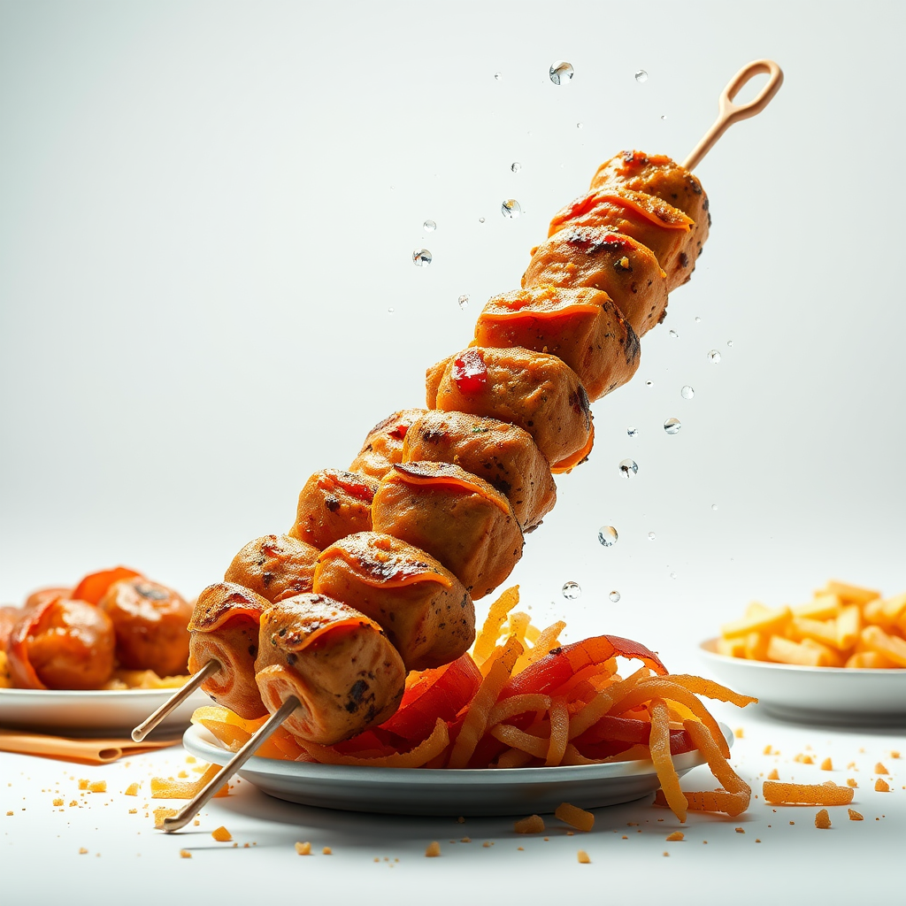 Commercial photography, colossal splash kebab, pristine lighting, studio environment, 8k high-definition rendering, ultra-high-resolution photography, intricately detailed, elaborate textures, on minimalist white background, 8k resolution, stock imagery, expert color grading, vertical aspect ratio.