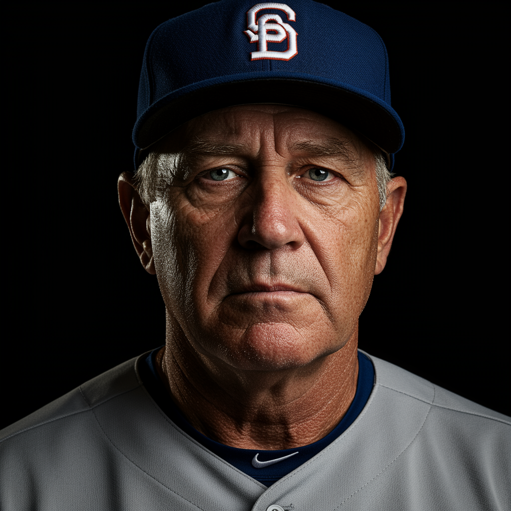 Commercial photography depicting a seasoned and weary baseball player, captured with studio lighting, showcasing every fine detail with 8k resolution, rendered with high professional quality. The image portrays the intricate features of age and experience on his face, set against a stark black background to emphasize his expression. The photograph is meticulously color graded for a refined, polished stock photo appearance, emphasizing the contrast and depth, captured in a 9:16 aspect ratio for a modern visual impact.