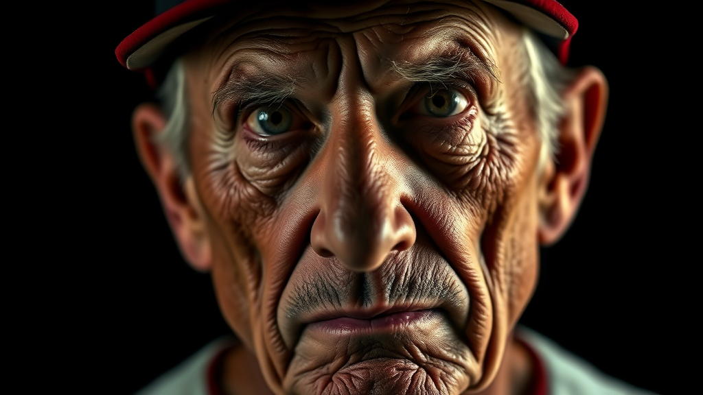 Commercial photography depicting the weary face of an aged baseball player, illuminated by studio lighting, 8k octane rendering, high-resolution capture with intricate detailing, showcasing fine details, set against a plain black background, stock photo quality, expertly color graded.