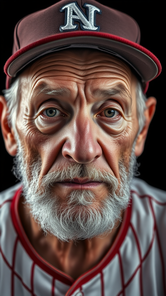 Commercial photography depicting the weary visage of an elderly baseball player, captured with studio lighting, 8k octane rendering, and high-resolution photography. Displaying intricate and fine details, the shot presents the subject on a black isolated background. As a stock photo, it features expert color grading to enhance realism and depth.