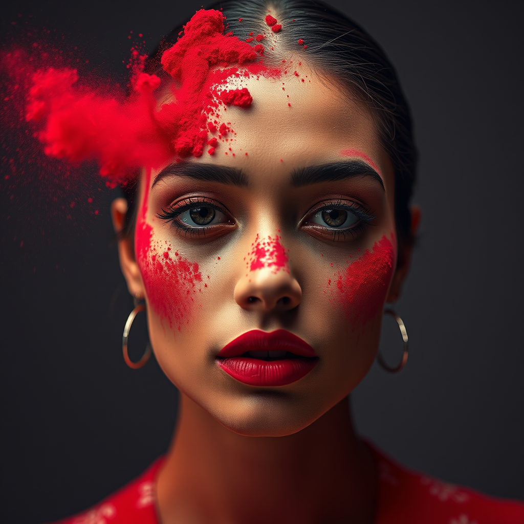 Commercial photography, dramatic burst of crimson powder, DIOR makeup, bright illumination, studio setup, 8k clarity rendering, ultra high resolution imagery, exceptionally intricate, subtle details, solitary backdrop, royalty-free image, expert color grading leverage, --v 4 --ar 9:16.