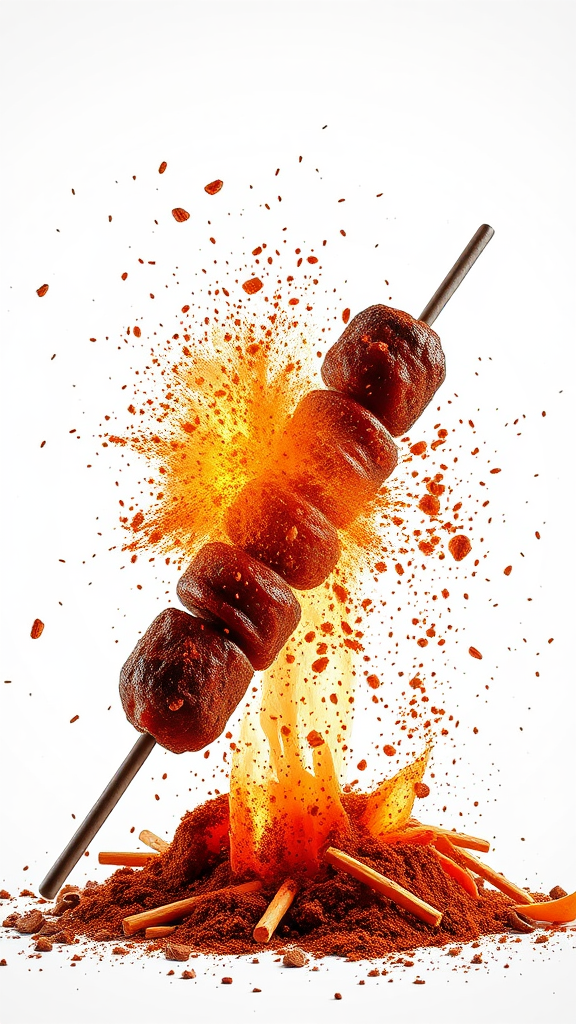 Commercial photography, dramatic explosion of a kebab, bright white lighting, studio environment, high-resolution 8k rendering, incredibly detailed, intricate textures, isolated on a plain white background, professional-grade stock photo, expert color grading, ultra-realistic imagery, vertical aspect ratio with fine-tuned enhancements.