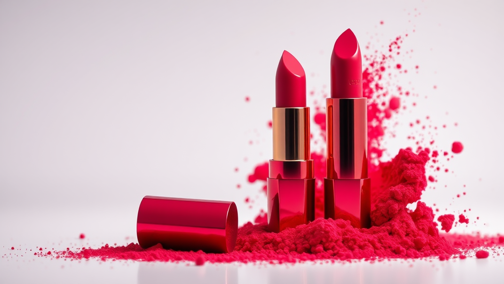 Commercial photography, dynamic burst of crimson powder, luxury lipstick, bright studio illumination, 8k octane render quality, ultra-high resolution image, meticulously detailed, intricate textures, solid background, stock imagery, expert color correction, capturing elegance, sleek design, professional composition, --aspect ratio 9:16