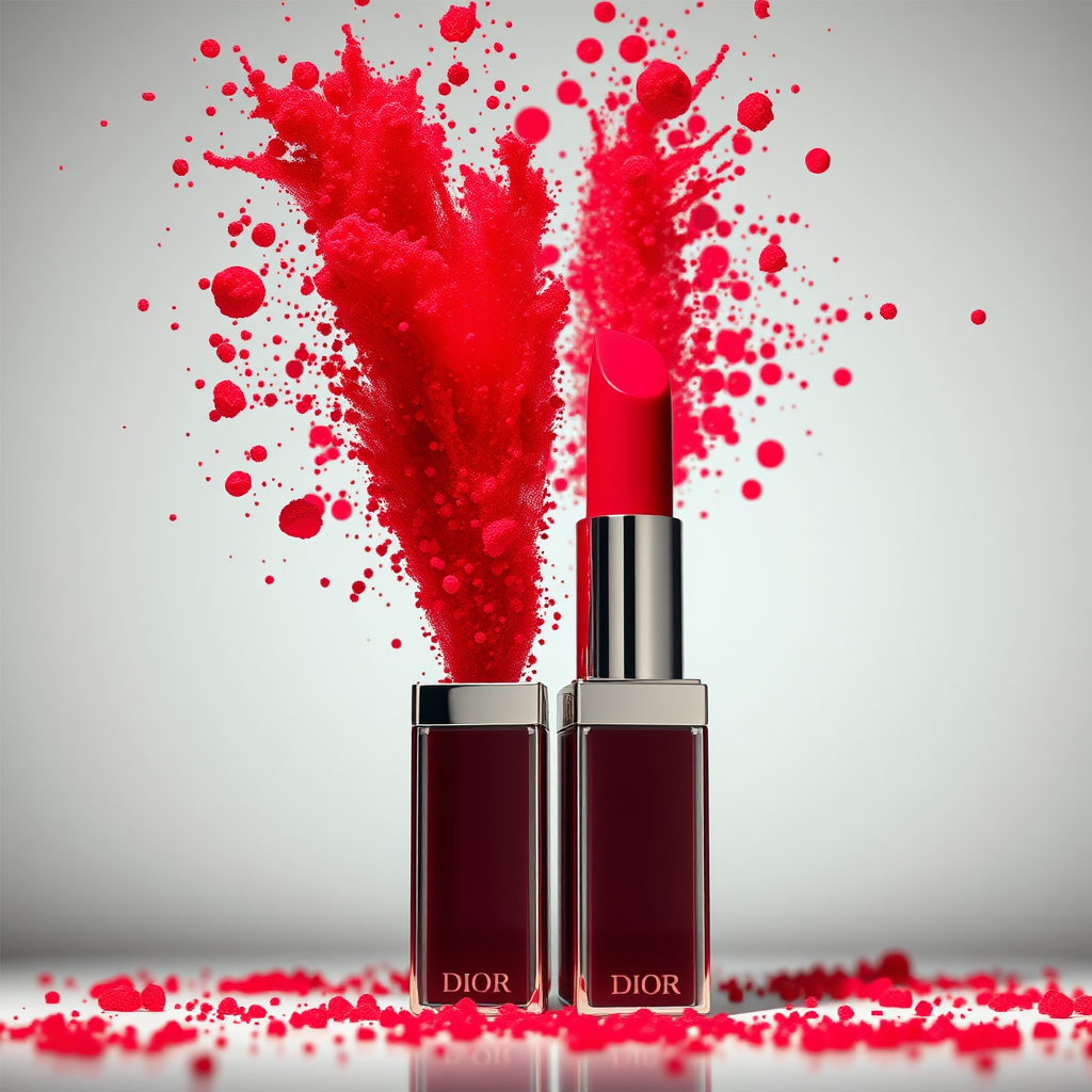 Commercial photography, dynamic eruption of crimson particles, DIOR lipstick focus, bright white illumination, studio setup, 8k octane rendering quality, ultra-high resolution capturing, remarkably intricate details, isolated against a simple background, stock photo style, expert color enhancement, vibrant imagery, --v 4 --ar 9:16