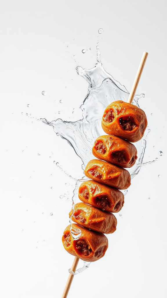 Commercial photography, dynamic splash kebab, bright studio lighting, ultra high-definition rendering, extremely detailed, intricate textures, on a white isolated background, 16k, premium commercial imagery, professional color enhancement, richly detailed focus, vertical orientation, high resolution stock photo, expertly curated aesthetics.