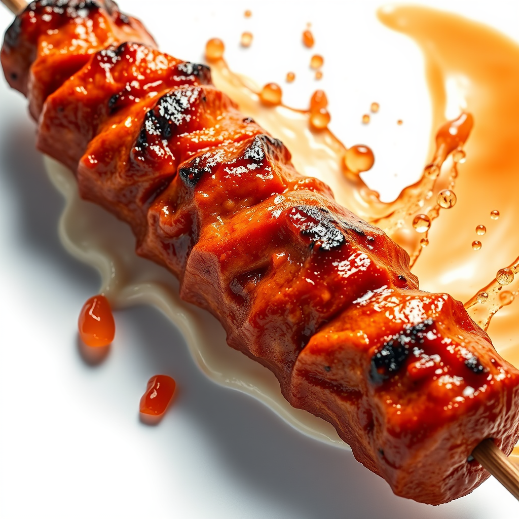 Commercial photography, gigantic splash of a juicy kebab, bright studio lighting, 8k ultra-high definition rendering, high resolution image capturing intricate details, set against a seamless white background, commercial stock photo quality, expertly color graded, enhanced textures, --v 4 --ar 9:16.