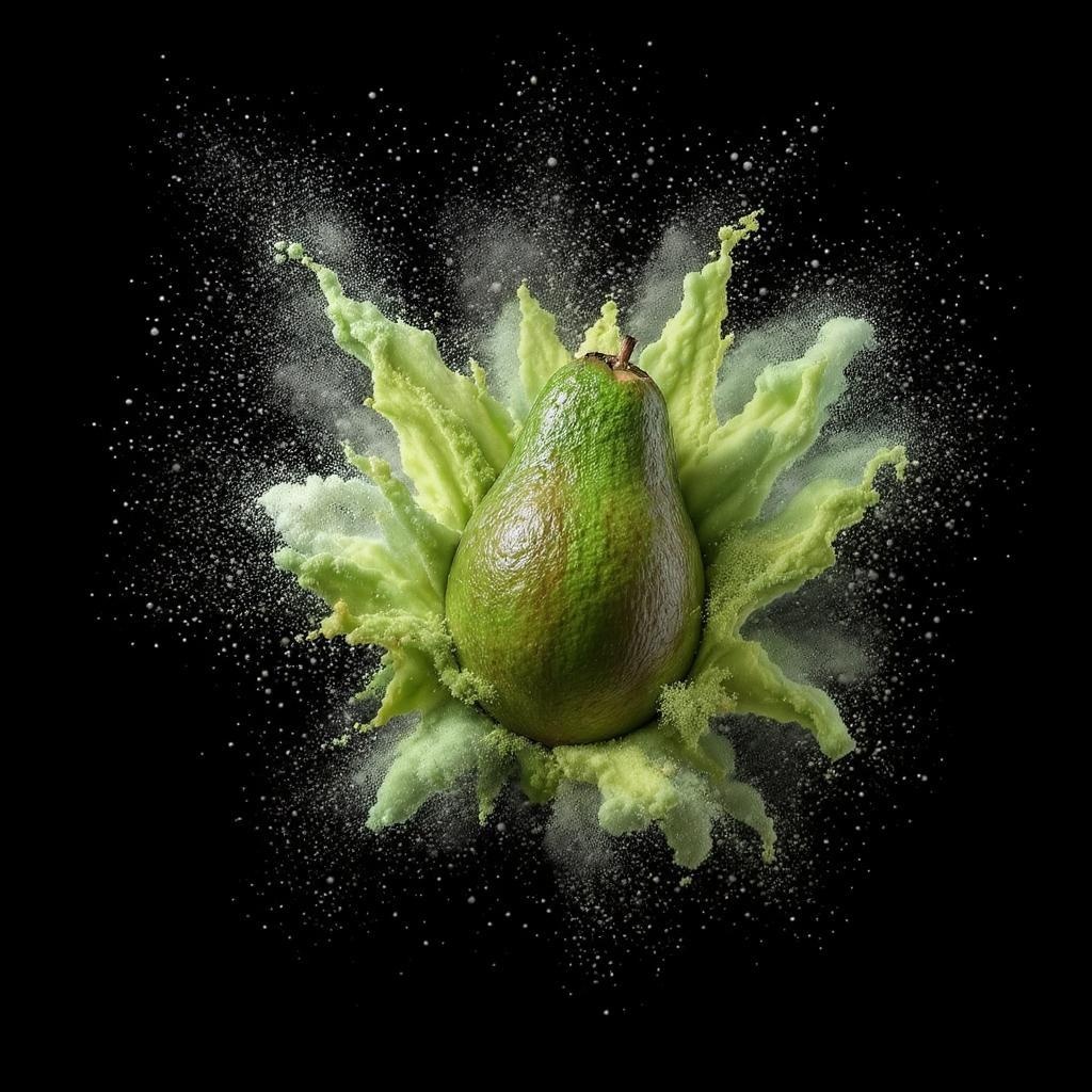 Commercial photography of a dynamic burst of vibrant green powder surrounding an avocado, illuminated with crisp white lighting from multiple studio angles, captured in stunning 8k resolution. The image showcases intricate details and textures of the avocado and dust against a stark black background. Professionally color-graded, this high-resolution stock photo emphasizes clarity and fine details, creating a dramatic visual impact with its vertical 9:16 aspect ratio.