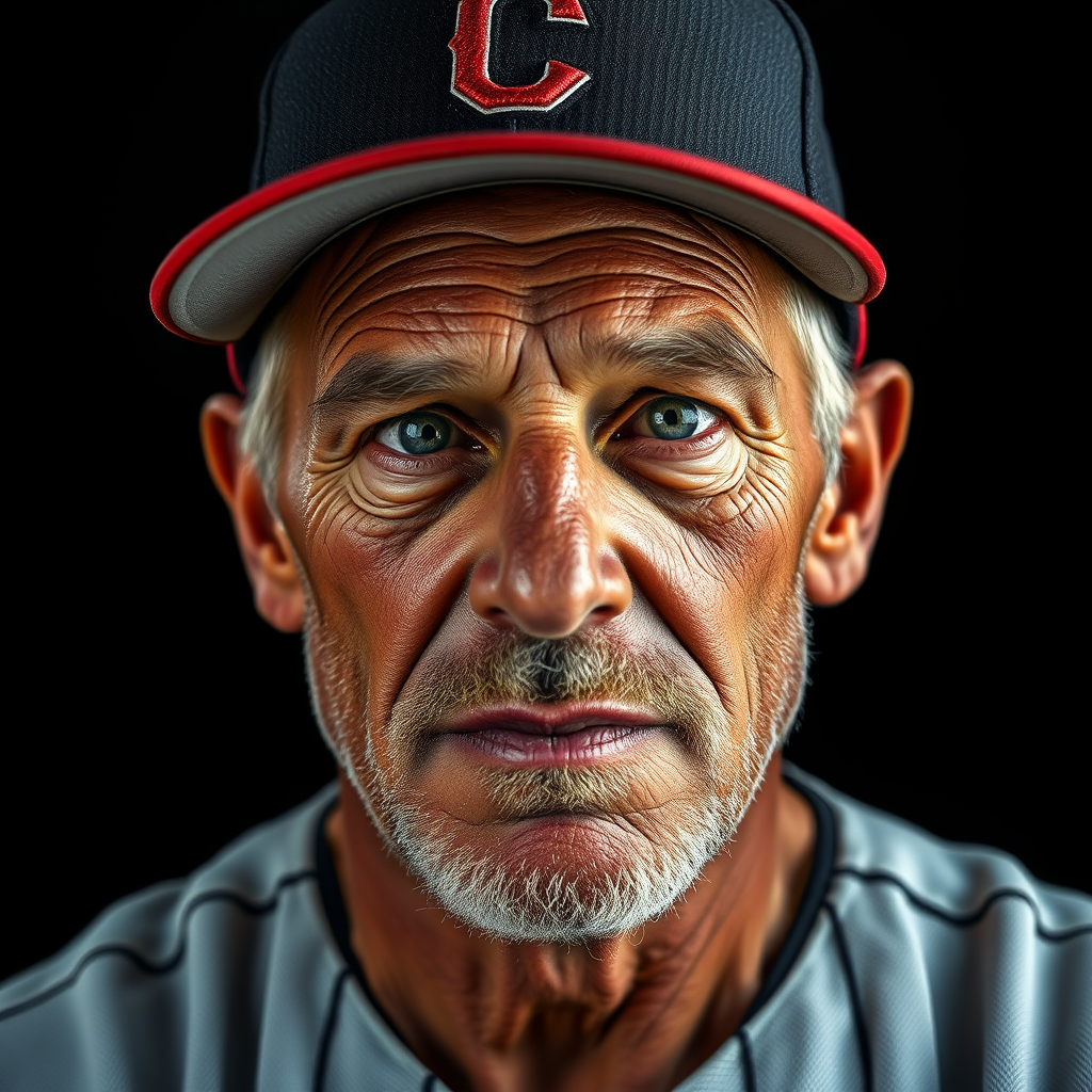 Commercial photography of a weathered, seasoned baseball player, captured under studio lighting with 8k octane rendering. High resolution photography showcasing incredibly detailed features and fine textures, set against a solid black background. Stock photo style with expert color grading, aspect ratio 9:16, version 4 inspired.
