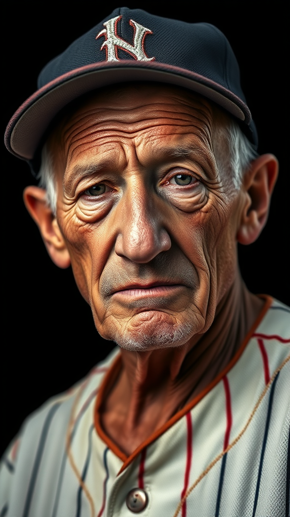 Commercial photography of an aged, weary baseball player, captured with studio lighting; ultra high-resolution photography with meticulous detail captures every fine line and expression; set against a stark black background for dramatic effect; professional color grading enhances the texture of the skin and depth of the image, creating a stock photo with impeccable clarity and precision, shot in a portrait orientation to emphasize the character's enduring spirit.