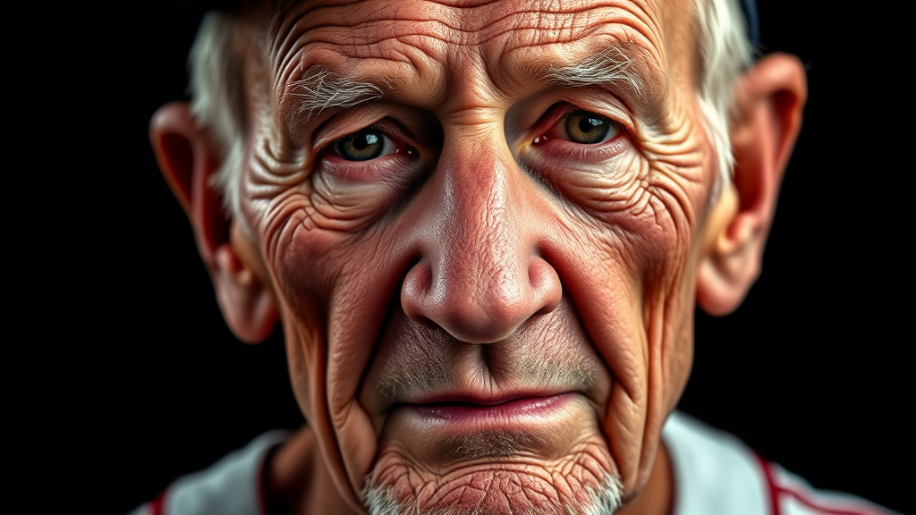 Commercial photography of an elderly, weathered baseball player, captured with studio lighting in 8k ultra-high-definition rendering. The focus is on the intricate details of his face, highlighting the fine lines and rugged texture of his skin. Set against a plain black background, this high-resolution stock photo is professionally color graded to emphasize the character and depth of the subject. The composition maintains a portrait orientation, showcasing the years of experience etched into his expression.