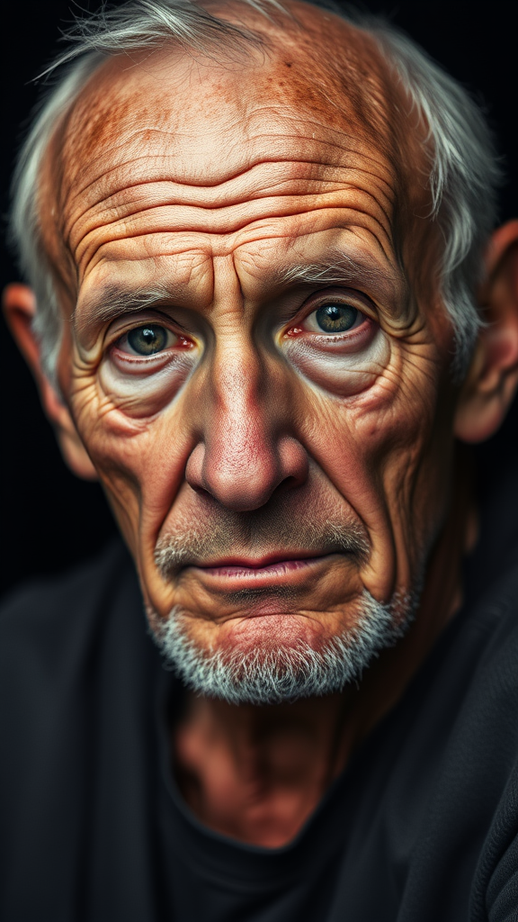 Commercial photography of an old, weary baseball player's face, captured under precise studio lighting. Incredibly high-resolution with meticulous attention to detail, the image portrays the deep lines and textures of experience. Set against a plain black background, this stock photo is enhanced by expert color grading, bringing out the character and history in the subject's expression. Rendered in 8k octane for exceptional clarity and depth, the portrait maintains its core focus while exploring subtle creative nuances.
