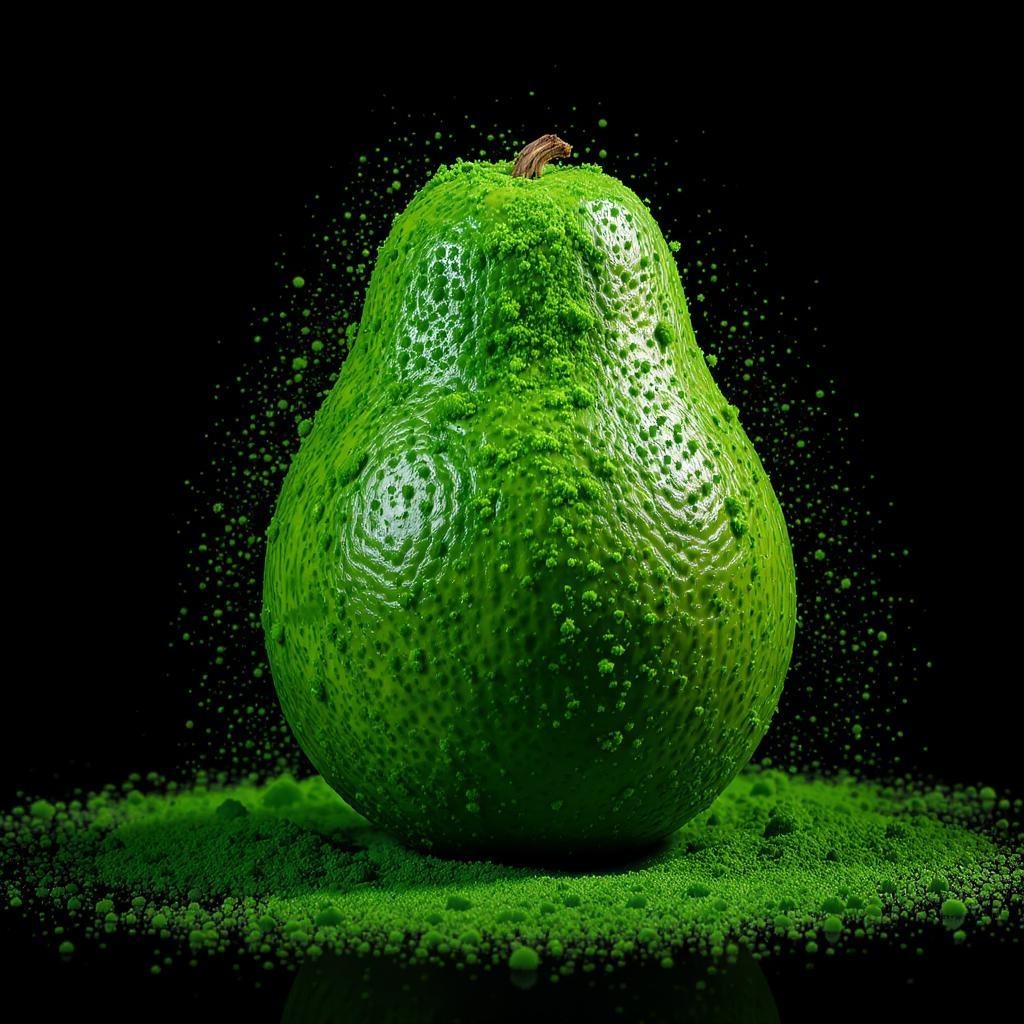 Commercial photography, vibrant burst of emerald dust, ripe avocado, bright illumination, studio setup, ultra-high-definition rendering, highly detailed imagery, intricate textures, against a solid black background, stock photo style, expert color enhancement, captured in vertical format.