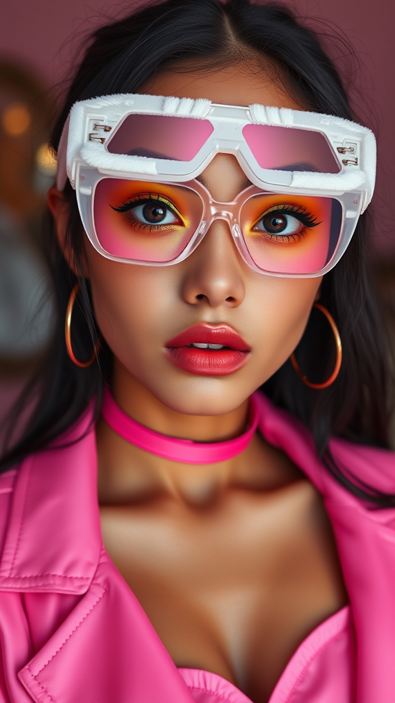 Commercial portrait of a stunning multiracial girl with chiseled cheeks and tearful, expressive eyes, wearing a bold pink jacket with a low neckline. Her outfit features a strapless design complemented by a sleek choker, and the style is reminiscent of liquid metal with deconstructed tailoring. The shot captures the essence of webcam photography with a touch of duckcore aesthetics, accentuated by bold curves and a chinapunk vibe. She dons an innovative collaboration piece by Jacquemus and Moncler: white translucent fur sunglasses that add an element of futuristic glamour. The overall image is hyper-realistic and detailed, presented in glorious 8k resolution.