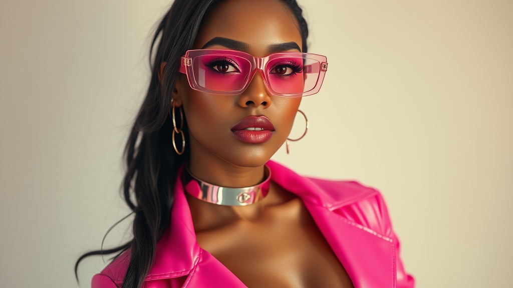 commercial portrait of a stunning multiracial woman in a vibrant pink jacket with defined cheekbones, glistening eyes, and an air of dominance, showcasing a low-cut, strapless design adorned with a sleek choker. Her attire appears as if crafted from liquid metal with creatively deconstructed tailoring, captured through the lens of webcam photography. Embodying duckcore aesthetics with daring silhouettes, she epitomizes the fusion of chinapunk influences, featuring a unique collaboration between Jacquemus and Moncler: striking white translucent fur sunglasses. The image is hyper-realistic, with intricate detailing in 8k resolution.