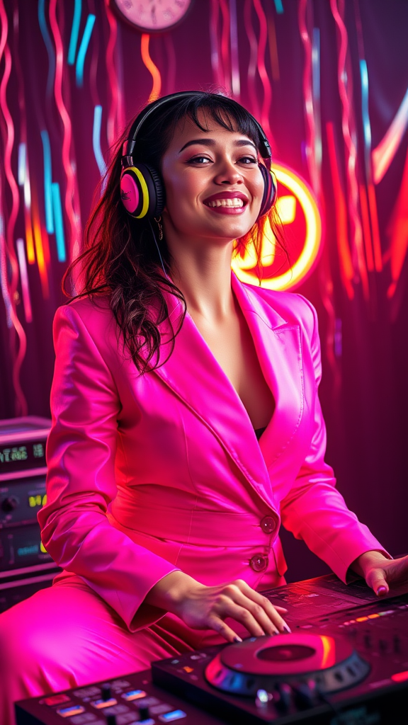 Commercial portrait of DJ Chickie in a vibrant pink suit enjoying her music, styled as animated gifs with a happycore vibe. She embodies a joyful, dynamic energy with a feminine silhouette, captured in the style of a fluid video. The scene blends in elements of pigeoncore, as if made of liquid metal with wavy textures, maintaining a raw style and an intriguing aspect ratio of 65:87, infused with a creative spark and elevated intensity.