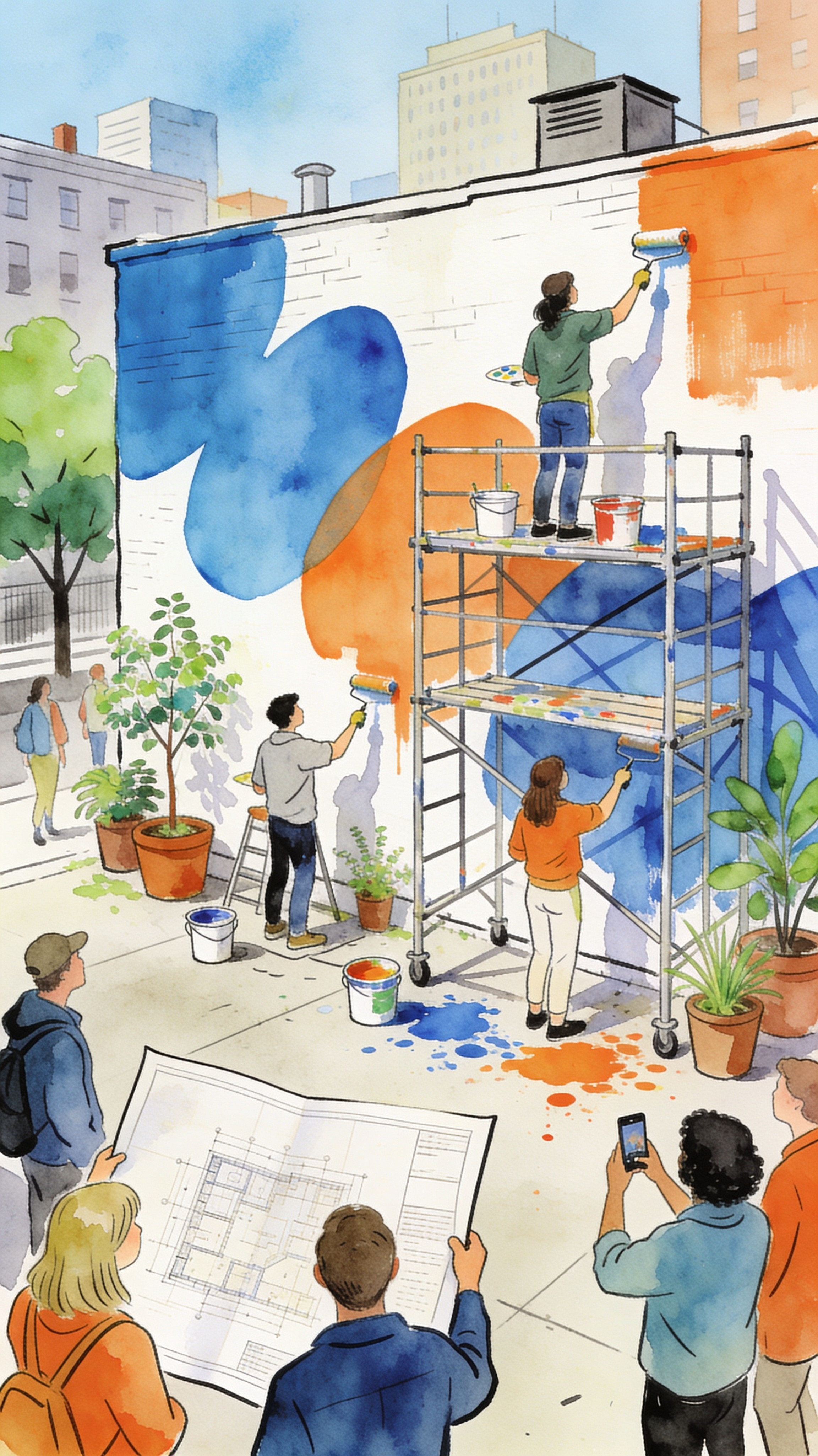 A vibrant outdoor scene of a community mural painting project, with multiple people actively painting on scaffolding and ground level, while others are observing and planning. The mural features abstract shapes in blue and orange. The art style is a lively sketch illustration with watercolor washes, characterized by black outlines and soft color fills. Bright, natural daylight creates a cheerful and active mood. The color palette is dominated by blues and oranges, with complementary greens from potted plants and trees, and muted tones for people's clothing and the cityscape. Notable details include scaffolding, paint buckets, spilled paint on the ground, a large blueprint being held, and people taking photos.