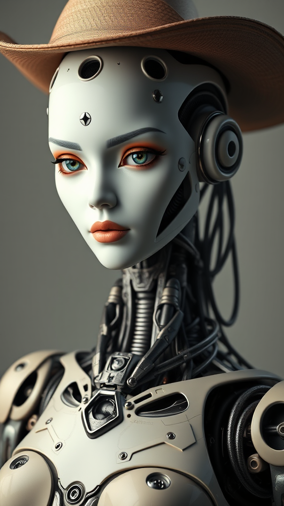 Complex 3D render of a stunningly detailed porcelain-profiled female robot, portrayed with ultra-realism. The scene captures a cowboy-style shot focusing on the robot's upper body, featuring prominent features and a highly intricate design. The robot's face appears duplicated, presenting a unique cloned effect with cross-eyed expression. The design includes an elongated neck and additional fingers on her exquisitely crafted hands, adding a sense of mutation and evolution. The image is presented in 8k UHD with HDR, ensuring ultra-high definition quality. Artistic tweaks like slight mutations and elongated features evoke a sense of futuristic creativity, while avoiding low-resolution, out-of-frame elements, blurry effects, jpeg artifacts, and any textual distractions or logos.