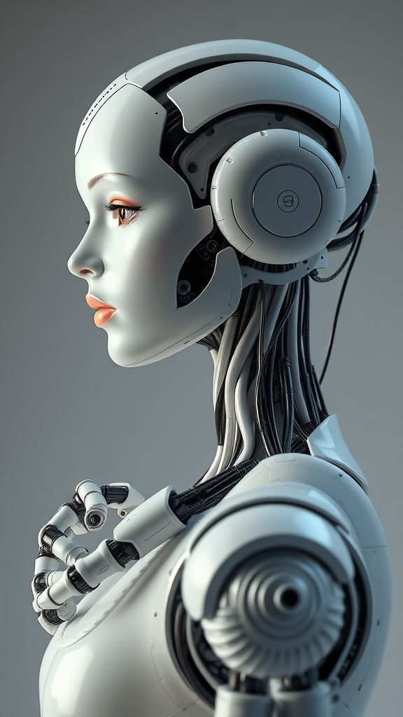 Complex 3D render of an ultra-detailed porcelain profile of a beautiful female robot, featuring an incredibly realistic depiction with intricate details. The scene is composed in a cowboy shot, highlighting the enhanced curvature and elegance. Rendered in 8k UHD with HDR, the robot showcases unique design variations such as duplicate elements and slight mutations like a cloned aspect of the facial structure. The visual includes distinct features such as cross-eyed orientation, an elongated neck, and uniquely articulated hands with extra fingers, emphasizing a blend of beauty and mechanical complexity. The background remains clean and focused, avoiding distractions like low resolution, out-of-frame elements, blurriness, and digital imperfections such as jpeg artifacts, watermarks, logos, or text that could detract from the viewing experience. This portrayal maintains a cohesive aesthetic while showcasing a vivid, surreal representation of robotic life.