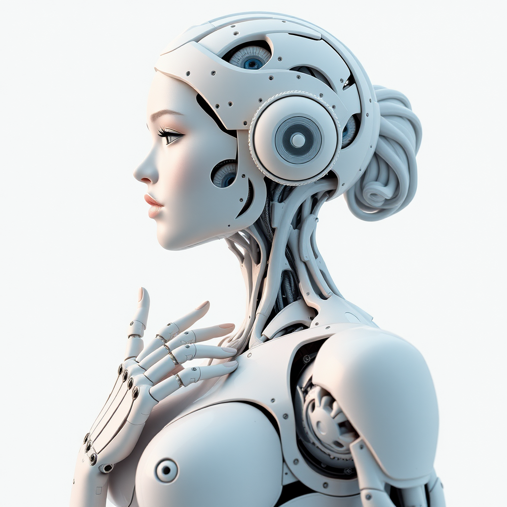 Complex 3D render, ultra detailed of a stunning porcelain-looking robotic woman in profile, featuring intricate design elements, high detail, and an ultra-realistic style. The composition is a cowboy shot, highlighting the form with large breasts. Rendered in 8k, UHD, HDR quality, the piece includes creative elements of duplication and mutation, with cloned facial features, slightly crossed eyes, elongated neck, and additional fingers on hands. The artwork focuses on vivid, sharp details while avoiding low resolution and artifacts. There are no out-of-frame elements, blurriness, or visual disruptions such as JPEG artifacts, watermarks, logos, letters, or other distractions. The creative depiction combines realism with subtle surreal qualities, maintaining a cohesive and uncropped image.