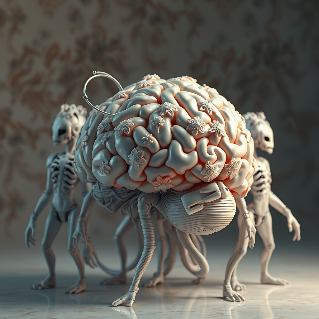 Complex 3d render ultra detailed of an exquisite porcelain human brain with cyborg and robotic elements, adorned with delicate lace and luxurious cyberpunk aesthetics; vibrant details showcasing cable electric wires, intricate microchips, and elegant design. Set in a beautiful studio with soft and rim lighting, creating a hyperrealistic texture and depth. The scene features deformed and unique figures with additional limbs and heads, forming a fascinating group of humanoid forms. A subtly distorted yet captivating arrangement, reminiscent of H. R. Giger's style, rendered in 8k resolution for striking detail. The composition includes a rich, beautiful background, slightly abstract, enhancing the surreal atmosphere.
