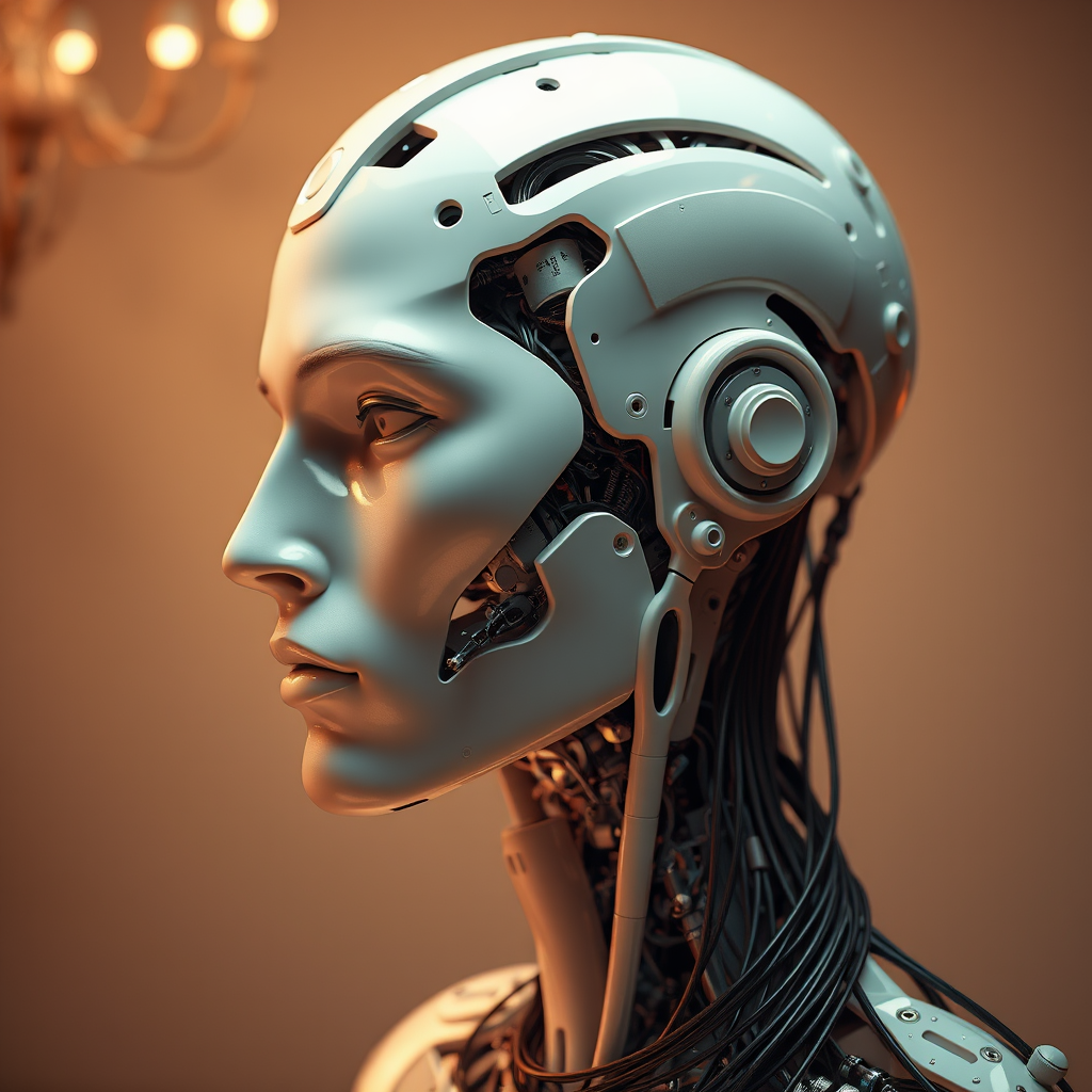 Complex 3D render, ultra-detailed profile of a stunning porcelain android male face, cyborg features with visible robotic elements. Set at 150 mm in a beautifully lit studio with soft rim lighting, showcasing vibrant and intricate details. Luxurious cyberpunk aesthetic with hints of lace, hyperrealistic representation highlighting anatomical and facial musculature intertwined with cables, electric wires, and microchips. The scene is elegant, with an exquisite background rendered in octane at 8k. Sketch elements blend into the composition, while deliberately low resolution adds imperfections like JPEG artifacts. Despite some flaws like blurred areas, disfigured elements, and exaggerated features, the portrayal remains captivating. It includes misplaced proportions, elongated fingers, distorted anatomy, and multiple limbs, capturing an otherworldly beauty within a complex cyborg form.
