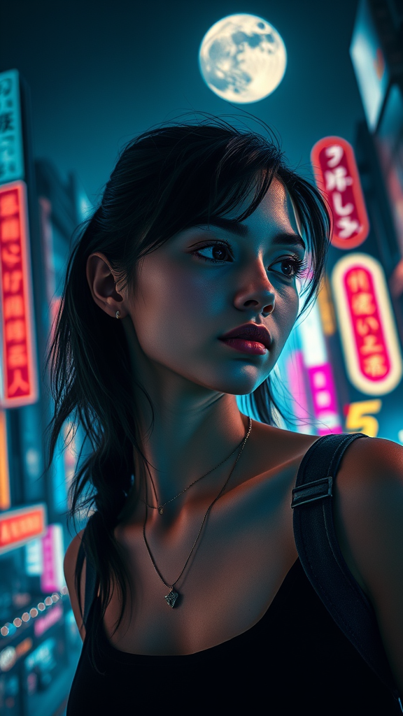 Complex detail, rich depth of field, young woman, futuristic cityscape, cyberpunk atmosphere, vibrant neon glow, illuminated signs, midnight sky, full moon, dynamic three-quarter view, captivating silhouette, delicate necklace, atmospheric string lights.