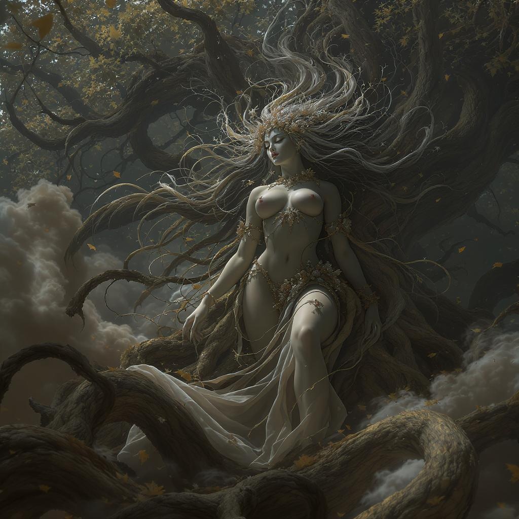 complex hyper-maximalist intricate cinematic depiction of a floral forest deity with cascading long hair and minimal garments. the scene is reminiscent of Magic the Gathering, featuring swirling clouds of leaves and gusting winds entwined with spirals of lianas around an immense ancient tree. the deity strikes a stunning pose, capturing the essence of beauty in an Omnious fashion. Inspired by ArtStation and rendered in Unreal Engine, the scene is brought to life with dramatic lighting and deep shadows, enriched by tribal dark fantasy and orthodox symbolism elements. The composition evokes magic realism with ambient occlusion and volumetric lighting to create an emotional ambiance, presented in stunning 8k resolution.