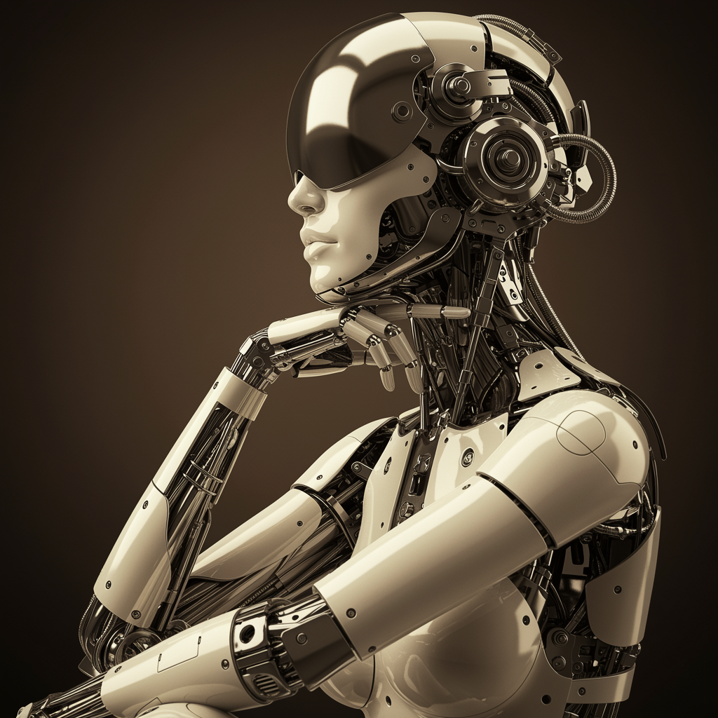 Complex 3D render ultra-detailed of a stunning porcelain profile woman android, full-body, cyborg, showcasing intricate robotic parts. Beautifully illuminated with studio soft light and rim light, vibrant details highlight the luxurious cyberpunk aesthetic. Featuring delicate lace and hyperrealistic anatomical elements like facial muscles, interwoven cable electric wires, and microchips. The setting is elegant, with a beautiful backdrop rendered in octane, echoing H. R. Giger's style, in 8k for optimal quality. The image is a true masterpiece illustration, extremely detailed, and suitable as a CG unity wallpaper. Focused on amazing fine details, this artwork captures an incredibly delicate and elegant design. The robotic figure features a silver helmet, illustrated in a contemplative sitting pose. The color palette leans towards sepia tones, providing a painterly feel, combined with cartoon and sketch influences. This expertly crafted piece is devoid of any low-res or anatomical inaccuracies, ensuring the highest quality depiction of a futuristic and mesmerizing robotic being.