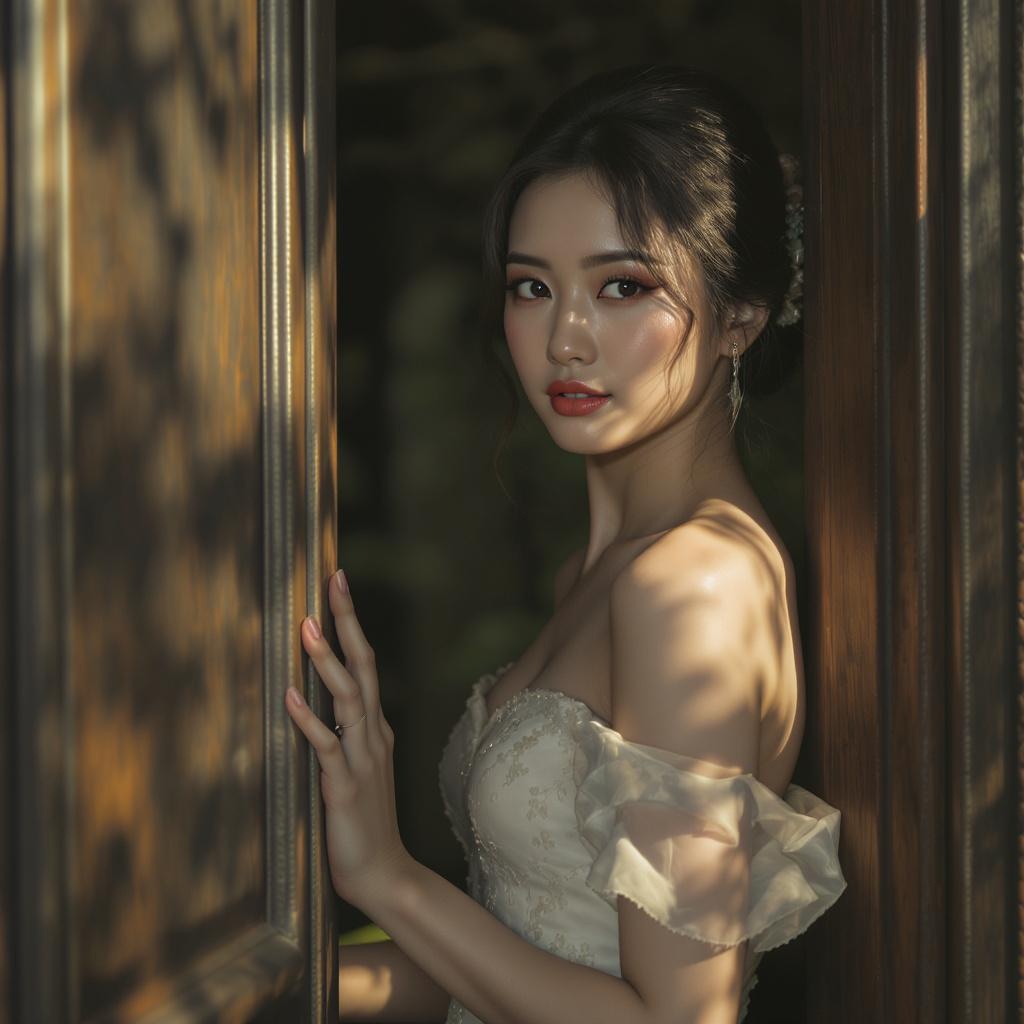 View this AI-generated image featuring a stunning composition capturing an individual wearing an elegant dress positioned gracefully in a doorway their face is exquisitely perfect with striking beauty and an abundance of fine detail the scene an outdoor photograph rendered with photorealism and illu