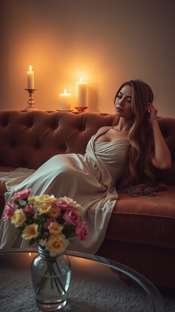 In a serene composition, a captivating woman reclines gracefully on a velvet couch in a softly illuminated room, the gentle glow of flickering candles casting playful shadows. Her long, flowing hair tumbles down her back in gentle waves, accentuating her elegance. Clad in a delicate silk gown that gleams subtly in the candlelight, she exudes an ethereal charm. On the coffee table before her, a vase brims with freshly cut flowers, infusing the space with a delightful fragrance. The atmosphere is one of tranquility and timeless beauty.