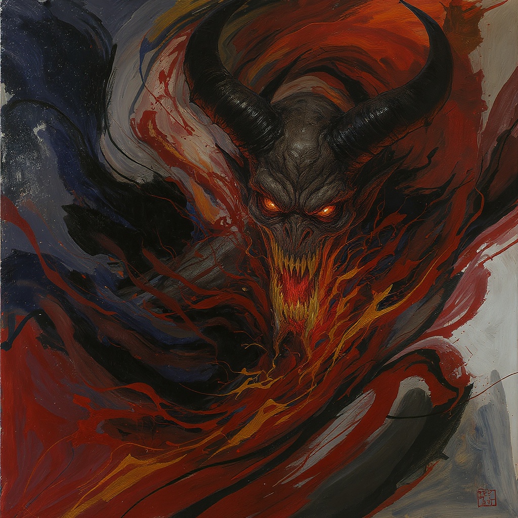 A dynamic concept art portrait of a male demon emerges, a terrifying visage with intricate, lifelike details. His skin is a twisted tapestry of sinew and shadow, textured with chaotic brush strokes that echo the raw energy of late 20th-century art. The composition flows with unsettling elegance, capturing the demon in a moment of fierce movement. High contrast between deep blacks and fiery reds enhances the drama, evoking flames dancing around his looming, jagged horns. Eyes glint with malevolent intelligence, while a turbulent storm of colors—inky indigo, smoldering amber, and piercing white—swirl around him, suggesting an otherworldly power that both terrifies and captivates.